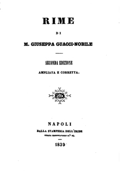 Di Giuseppina Guacci-Nobile (Napoli 1807- ivi 1848), poetessa di indubbio talento, è d’obbligo presentare la canzone dedicata a Leopardi; contrariamente alla prassi, nella sua prima versione pubblica, che per altro poco diverge dalla piú nota del 1847, tratta dalla terza edizione delle Rime. A lato il frontespizio della seconda ed., 1839, ove la canzone apparve, alle pp. 8-13.
